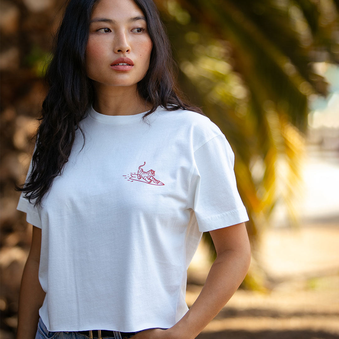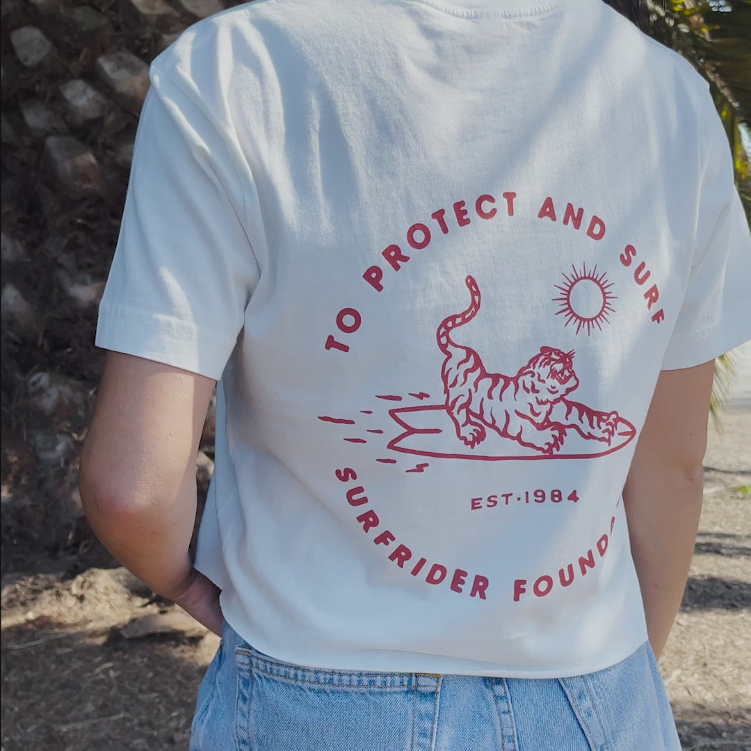 - Unisex white tee with To Protect And Surf™ print on front and back
