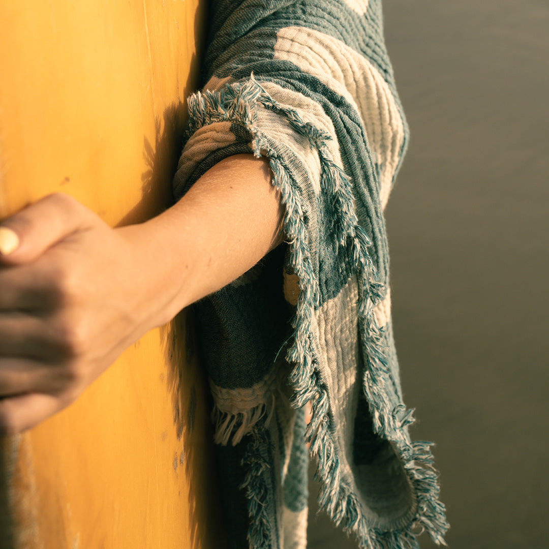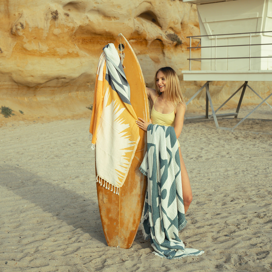 We are proud to partner with our friends at Sand Cloud to bring you this ocean-inspired blanket! The Vida - PARTY BLANKET™ - features a surf and beach-inspired pattern, that puts the party in PARTY BLANKET™! Not only is it absolutely massive, the four layer gauze jacquard weave makes it ultra-soft for comfortable hangs while the sand resistant technology will have you and your friends avoiding any party fails. Complete with a fringe tassel for added style points