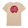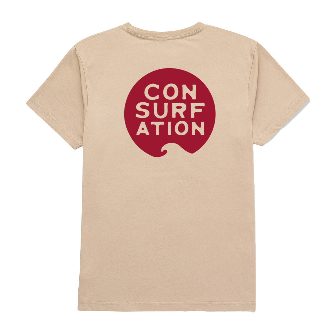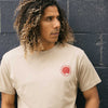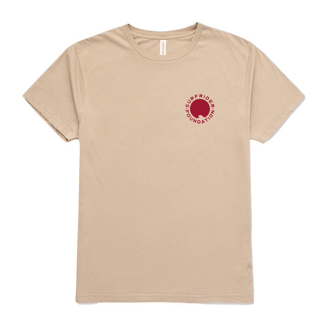 - Unisex oatmeal-colored tee with crimson-red print on front and back