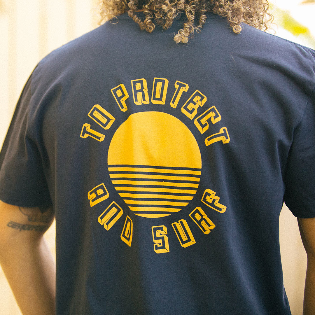 - Unisex navy pocket tee with To Protect And Surf™ print on front and back