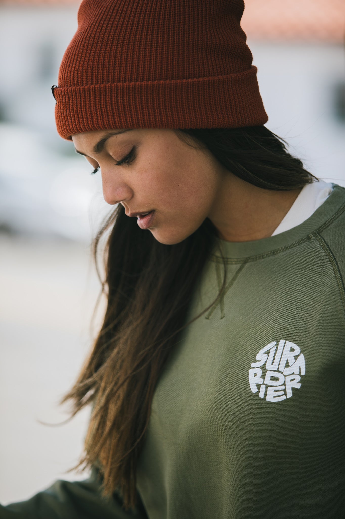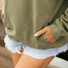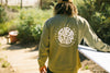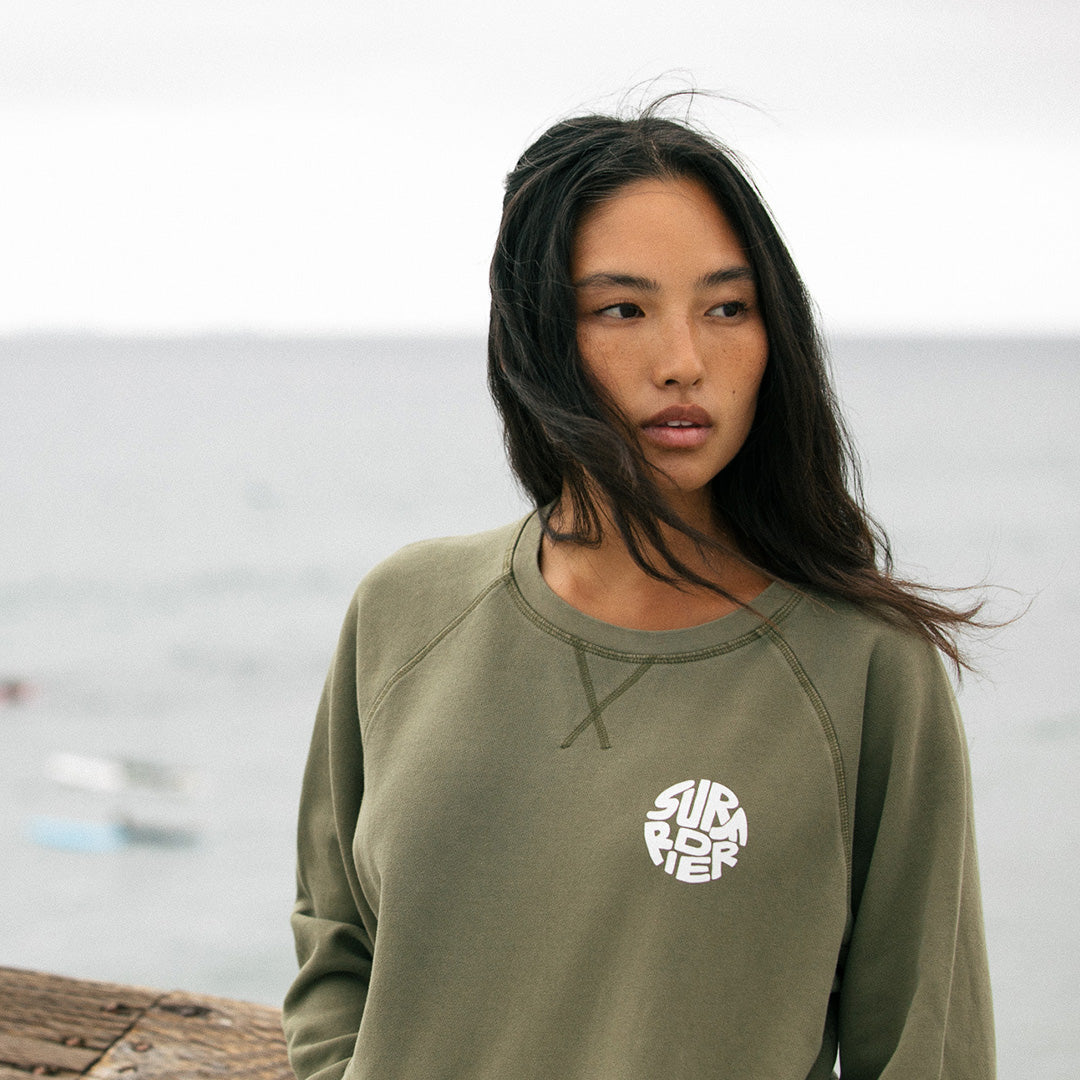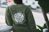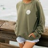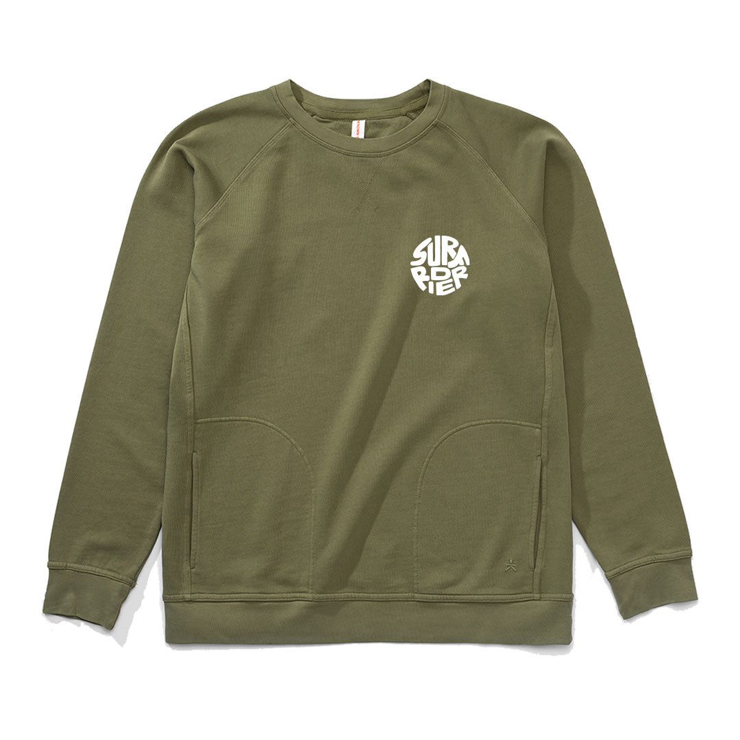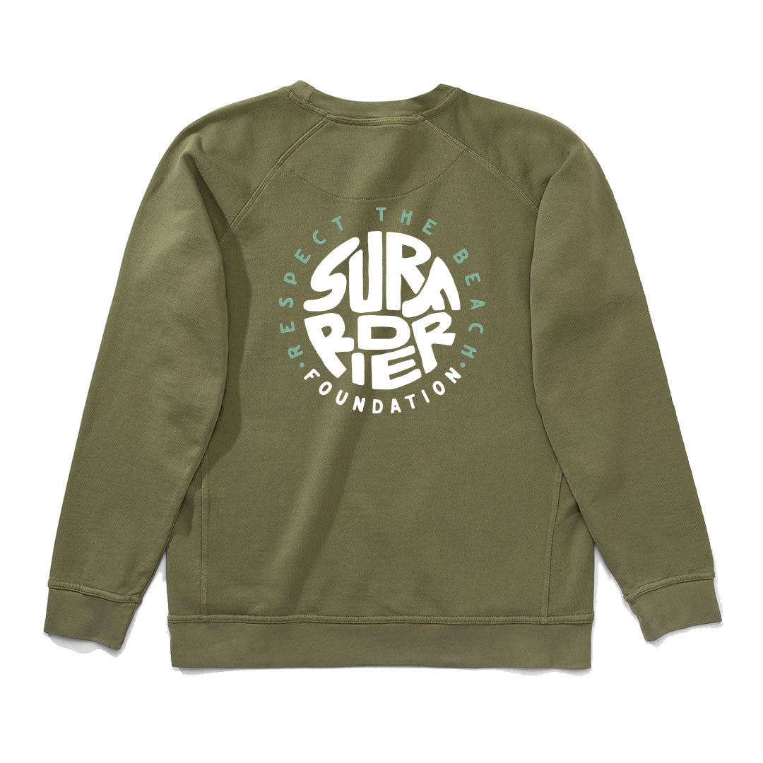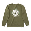 - Unisex army green crew sweater with print on front and back