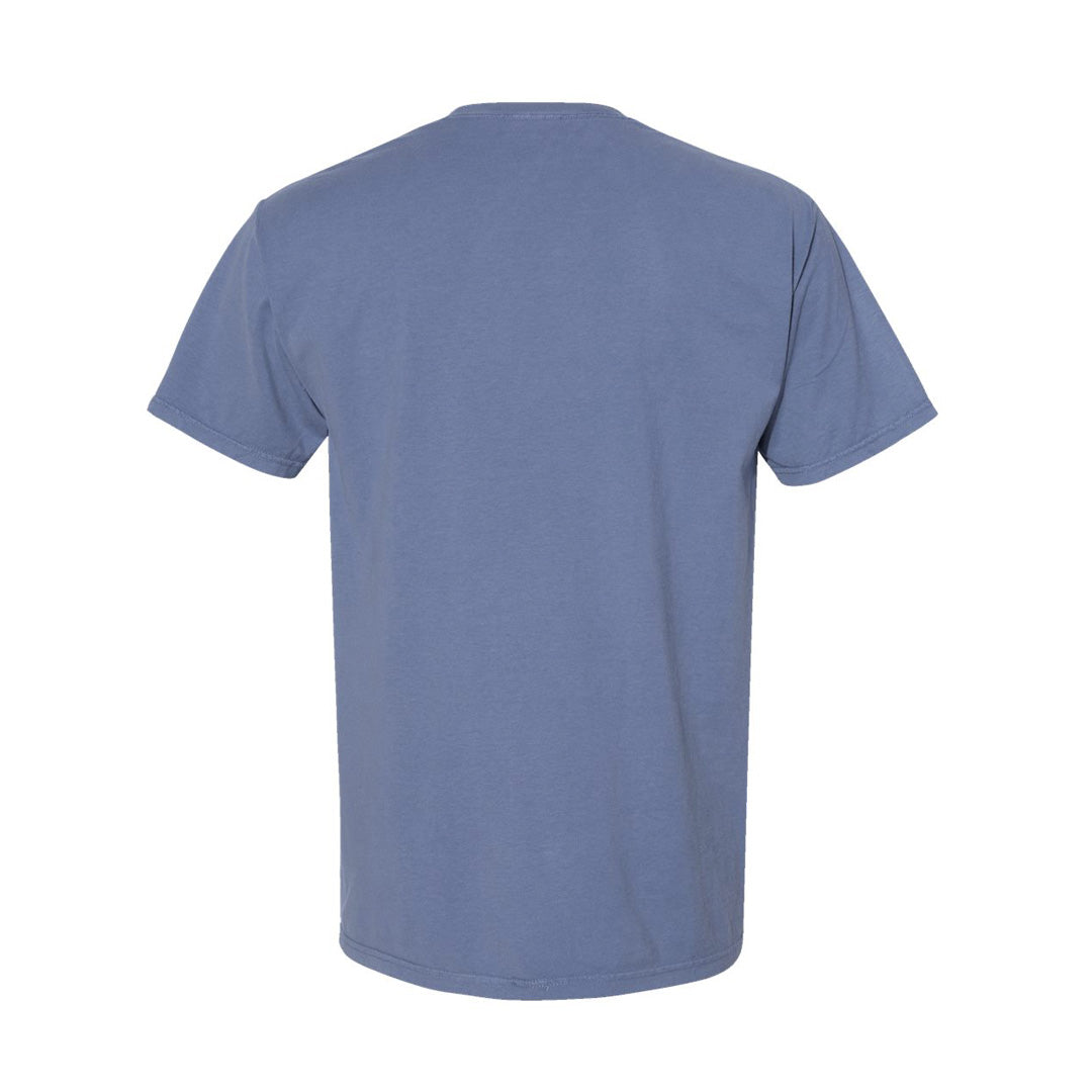 - Unisex blue garment-dyed tee with print on front